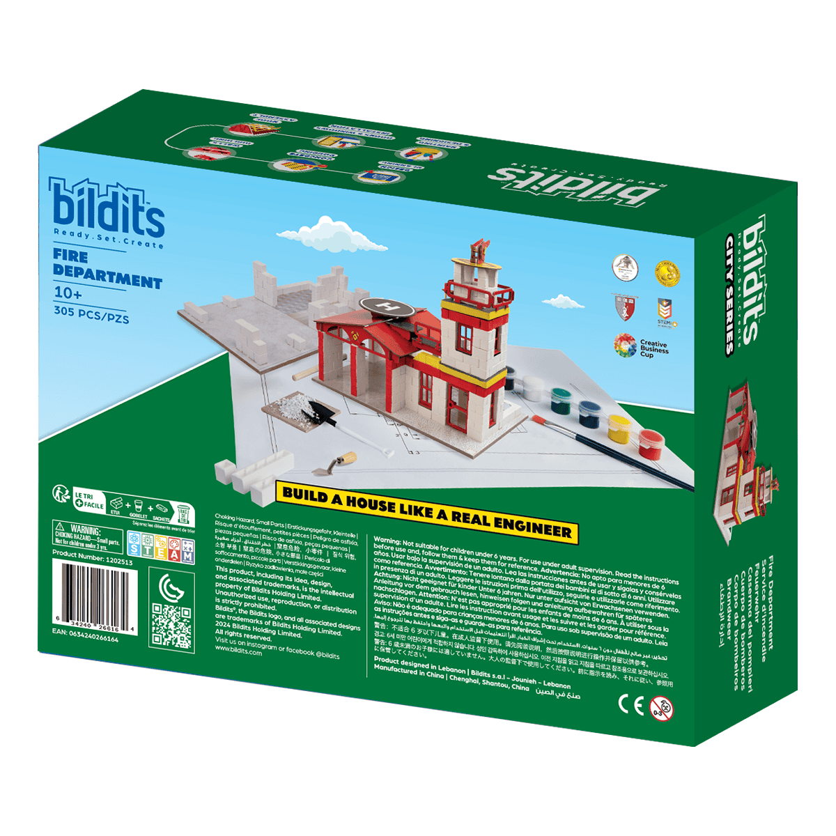 Save the day with the Fire Department kit! This set lets kids build a fully functional firehouse using real construction materials like bricks, plaster, and putty. Now with the addition of wood elements that require precise assembly, this kit encourages young builders to refine their skills in accuracy and attention to detail.It’s a fun and educational way to learn about fire safety, rescue operations, and teamwork while constructinga durable, real-world building