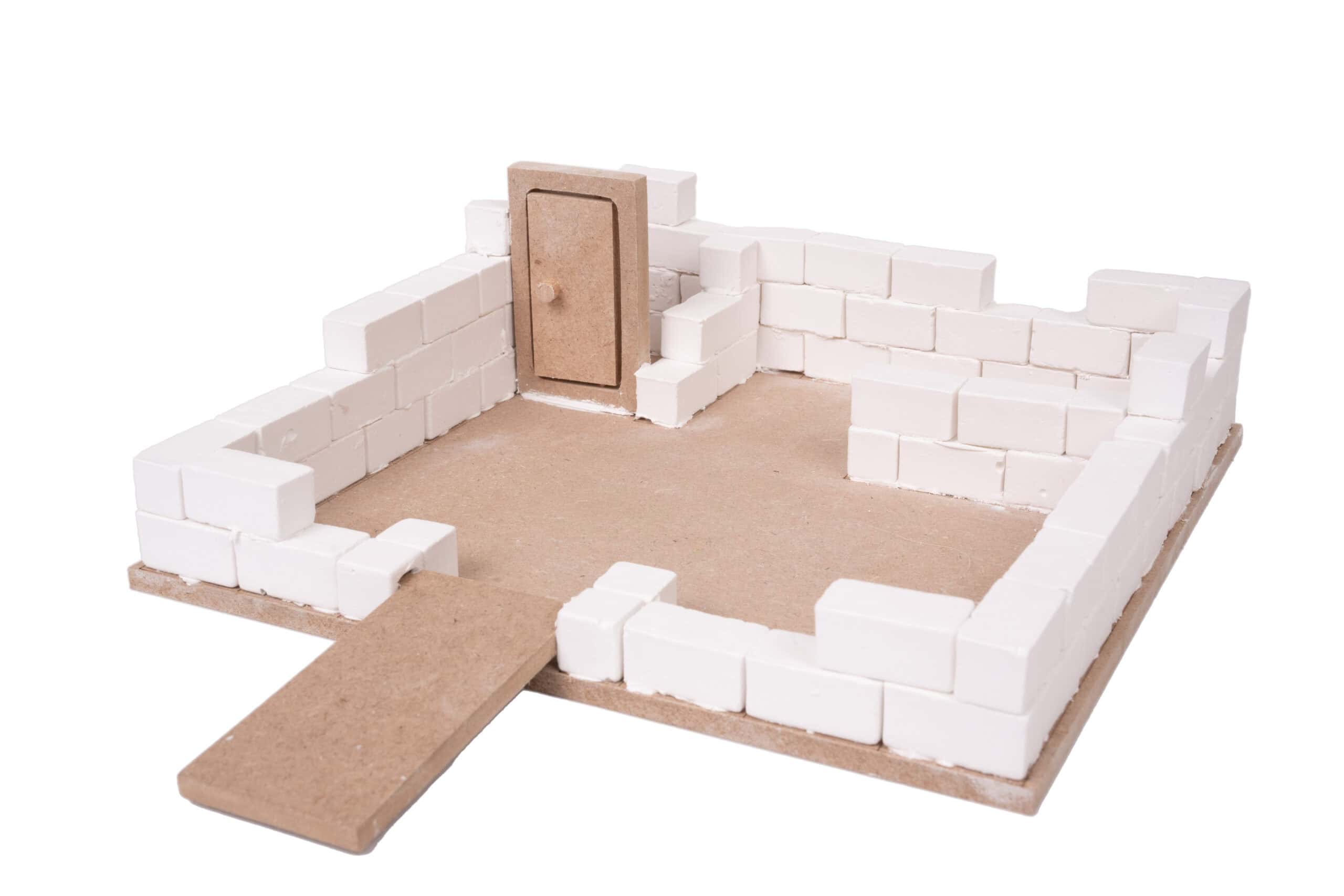 Kit offers a wide array of miniature tools and materials such as carboard molds, a plaster mix, putty, bricksand roof tiles, wooden roof structure, a trowel, a shovel, a paint set and additional accessories.